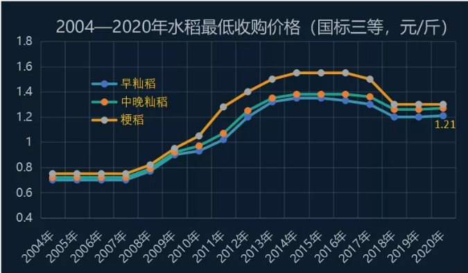 2020年國家繼續(xù)在稻谷主產(chǎn)區(qū)實(shí)行最低收購價(jià)政策。今年國標(biāo)三等早秈稻最低收購價(jià)為1.21元/斤,較上年上漲一分錢。