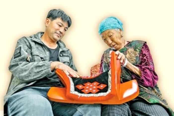 “馬鞍想要舒適,坐起來不勞累,鞍墊一定要做得結(jié)實,配色也很考究?!卑⒗拱透?9歲的母親扎力瑪,是札薩克圖刺繡興安盟級非物質(zhì)文化遺產(chǎn)代表性傳承人,也是他最好的幫手。扎力瑪布滿皺紋的手指捏著銀針,在靛藍(lán)色鞍墊上游走,卷草紋與云紋如流水般舒展。阿拉坦巴根伏在母親膝前,望著母親手中的鞍墊說:“母親繡的鞍墊配上我制作的馬鞍肯定好看?!?/p>