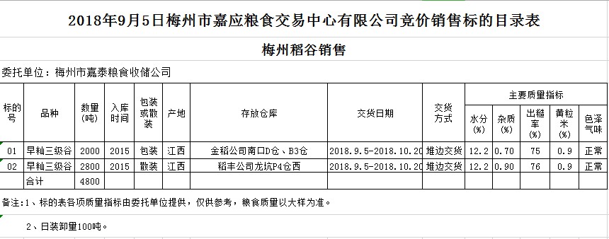 交易時間和地點:2018年9月5日(星期三)上午10時。廣東省梅州市彬芳大道南161號梅州市糧食交易中心3樓。