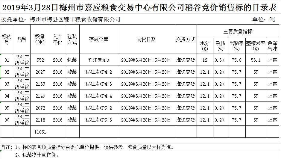 受客戶委托,梅州市嘉應糧食交易中心有限公司定于2019年3月28日(星期四)舉辦糧食競價交易會,梅州市梅縣區(qū)穗豐糧食收儲有限公司擬銷售2016年早秈稻11051噸。