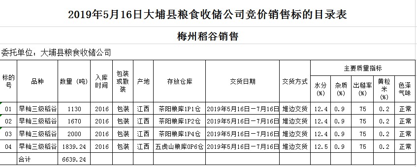 受客戶委托,梅州市嘉應(yīng)糧食交易中心有限公司定于2019年5月16日(星期四)舉辦糧食競(jìng)價(jià)交易會(huì),大埔縣糧食收儲(chǔ)公司擬銷售2016年早秈稻6639.24噸。
