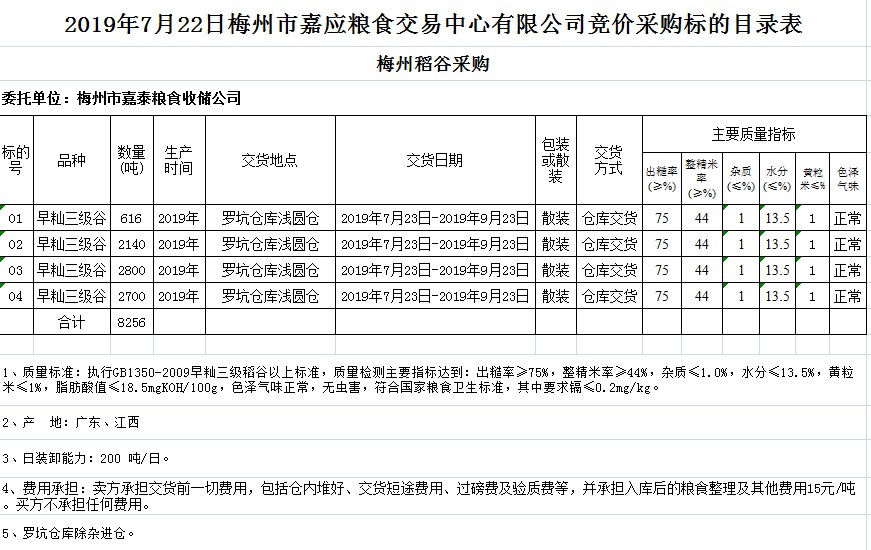 受客戶委托,梅州市嘉應(yīng)糧食交易中心有限公司定于2019年7月22日(星期一)舉辦糧食競價(jià)交易會,梅州市嘉泰糧食收儲公司擬采購2019年早秈稻8256噸。