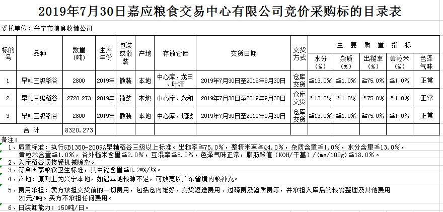 交易時間和地點:2019年7月30日(星期二)上午10時15分。廣東省梅州市彬芳大道南161號梅州市糧食交易中心3樓。