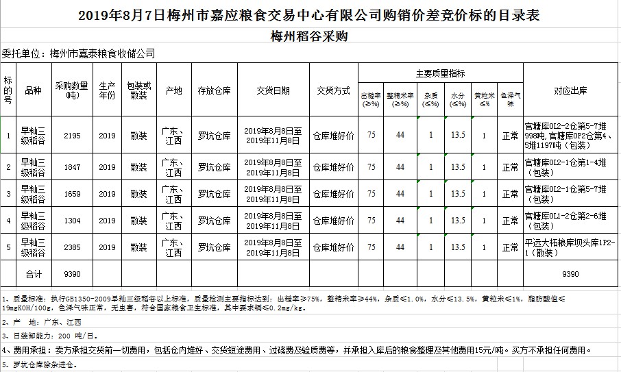 受客戶委托,梅州市嘉應(yīng)糧食交易中心有限公司定于2019年8月7日(星期三)舉辦稻谷購銷價差聯(lián)動標(biāo)的交易會,梅州市嘉泰糧食收儲公司擬銷售和采購早秈稻9390噸。