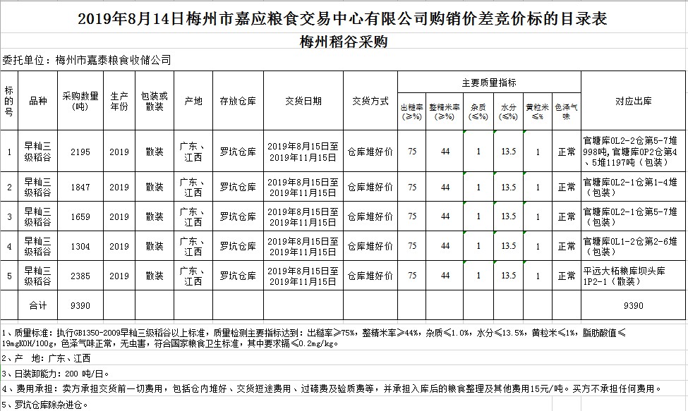 受客戶委托,梅州市嘉應(yīng)糧食交易中心有限公司定于2019年8月14日(星期三)舉辦稻谷購銷價差聯(lián)動標(biāo)的交易會,梅州市嘉泰糧食收儲公司擬銷售和采購早秈稻9390噸。