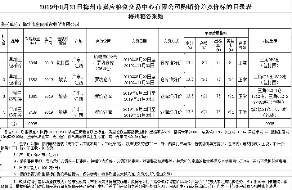 受客戶委托,梅州市嘉應糧食交易中心有限公司定于2019年8月21日(星期三)舉辦稻谷購銷價差聯(lián)動標的交易會,梅州市金良糧食收儲有限公司擬銷售和采購早秈稻9998噸。