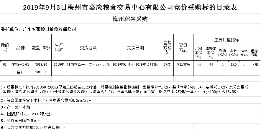交易時(shí)間和地點(diǎn):2019年9月3日(星期二)上午10時(shí)。廣東省梅州市彬芳大道南161號梅州市糧食交易中心3樓。