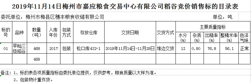 受客戶委托,梅州市嘉應(yīng)糧食交易中心有限公司定于2019年11月14日(星期四)舉辦糧食競價交易會,梅州市梅縣區(qū)穗豐糧食收儲有限公司擬銷售2017年早秈稻468噸。