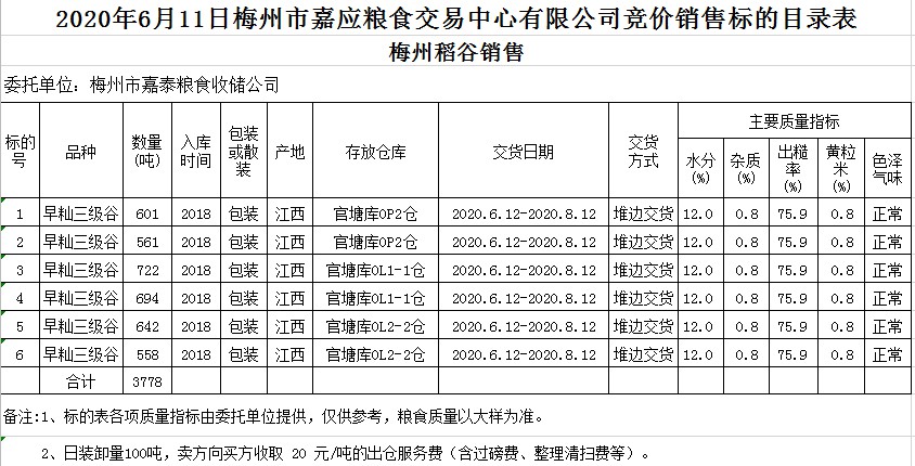 受客戶委托,梅州市嘉應(yīng)糧食交易中心有限公司定于2020年6月11日(星期四)舉辦糧食競價交易會,梅州市嘉泰糧食收儲公司擬銷售2018年早秈稻3778噸。