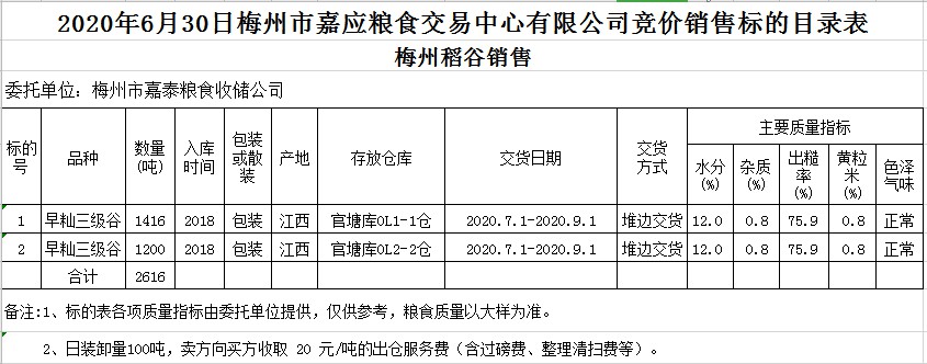 受客戶委托,梅州市嘉應(yīng)糧食交易中心有限公司定于2020年6月30日(星期二)舉辦糧食競(jìng)價(jià)交易會(huì),梅州市嘉泰糧食收儲(chǔ)公司擬銷售2018年早秈稻2616噸。