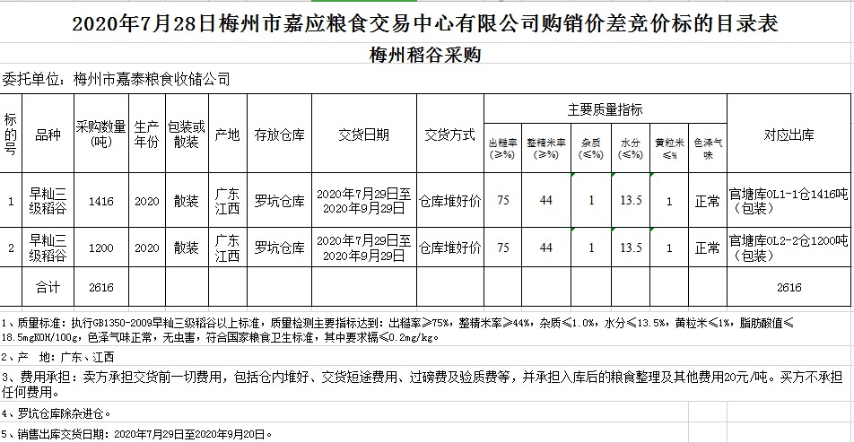 受客戶委托,梅州市嘉應(yīng)糧食交易中心有限公司定于2020年7月28日(星期二)舉辦稻谷購銷價差聯(lián)動標(biāo)的交易會,梅州市嘉泰糧食收儲公司擬銷售和采購早秈稻2616噸。