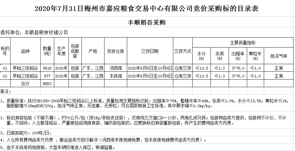 受客戶委托,梅州市嘉應(yīng)糧食交易中心有限公司定于2020年7月31日(星期五)舉辦糧食競(jìng)價(jià)交易會(huì),豐順縣糧食收儲(chǔ)公司擬采購2020年早秈稻6693噸。