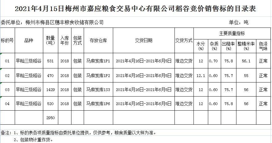 受客戶(hù)委托,梅州市嘉應(yīng)糧食交易中心有限公司定于2021年4月15日(星期四)舉辦糧食競(jìng)價(jià)交易會(huì)。梅州市梅縣區(qū)穗豐糧食收儲(chǔ)有限公司擬銷(xiāo)售2018年早秈稻2950噸。