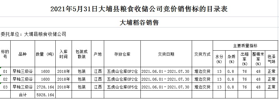 受客戶(hù)委托,梅州市嘉應(yīng)糧食交易中心有限公司定于2021年5月31日(星期一)舉辦糧食競(jìng)價(jià)交易會(huì)。大埔縣糧食收儲(chǔ)公司擬銷(xiāo)售2018年早秈稻5928.164噸。