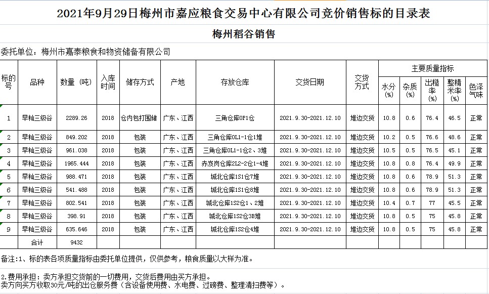受客戶委托,梅州市嘉應(yīng)糧食交易中心有限公司定于2021年9月29日(星期三)舉辦糧食競(jìng)價(jià)交易會(huì)。梅州市嘉泰糧食和物資儲(chǔ)備有限公司擬銷(xiāo)售2018年早秈稻9432噸。