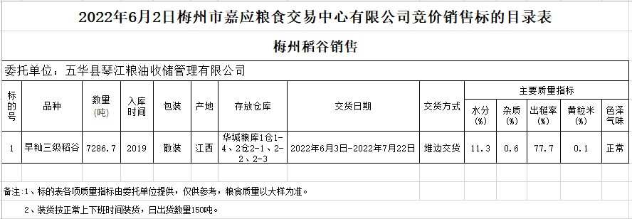 受客戶委托,梅州市嘉應(yīng)糧食交易中心有限公司定于2022年6月2日(星期四)舉辦糧食競價(jià)交易會(huì)。五華縣琴江糧油收儲管理有限公司擬銷售2019年早秈稻7286.7噸。