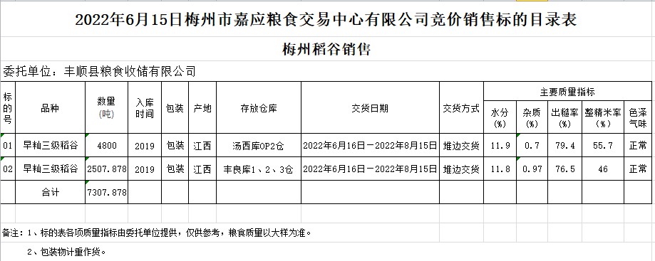 受客戶委托,梅州市嘉應(yīng)糧食交易中心有限公司定于2022年6月15日(星期三)舉辦糧食競價(jià)交易會。豐順縣糧食收儲有限公司擬銷售2019年早秈稻7307.878噸。