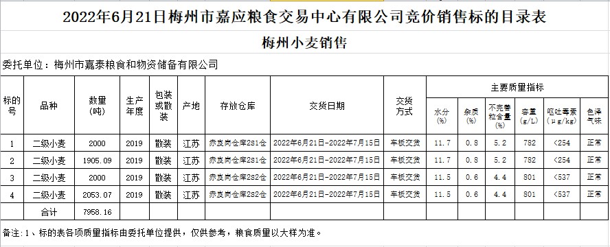 受客戶委托,梅州市嘉應(yīng)糧食交易中心有限公司定于2022年6月21日(星期二)舉辦糧食競(jìng)價(jià)交易會(huì)。梅州市嘉泰糧食和物資儲(chǔ)備有限公司擬銷售2019年小麥7958.16噸。