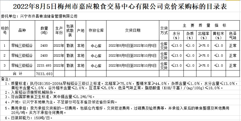 受客戶委托,梅州市嘉應(yīng)糧食交易中心有限公司定于2022年8月5日(星期五)舉辦糧食競價(jià)交易會。興寧市齊昌糧油儲備管理有限公司擬采購2022年早秈稻7033.693噸。