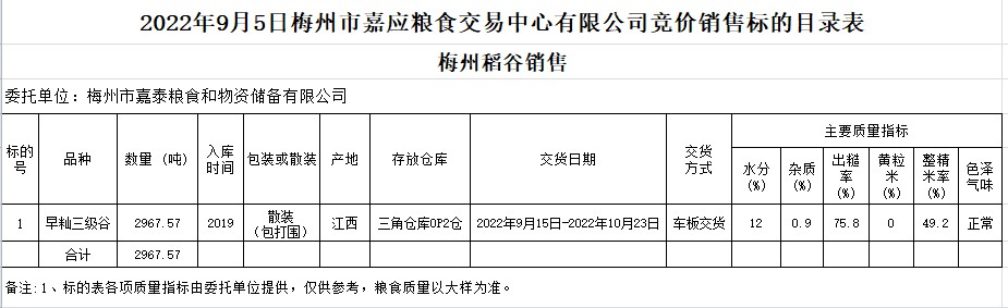 受客戶委托,梅州市嘉應(yīng)糧食交易中心有限公司定于2022年9月5日(星期一)舉辦糧食競(jìng)價(jià)交易會(huì)。梅州市嘉泰糧食和物資儲(chǔ)備有限公司擬銷售2019年早秈稻2967.57噸。