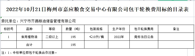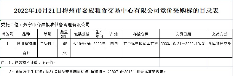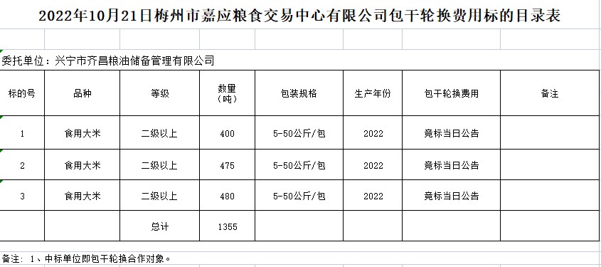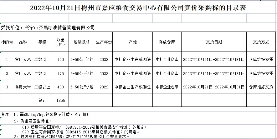 受客戶委托,梅州市嘉應(yīng)糧食交易中心有限公司定于2022年10月21日(星期五)上午10時(shí)在廣東省梅州市彬芳大道南161號(hào)梅州市糧食交易中心3樓,舉辦興寧市本級(jí)成品糧油動(dòng)態(tài)儲(chǔ)備競價(jià)采購及包干輪換費(fèi)用公開招標(biāo)。