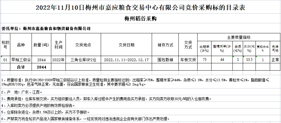 受客戶委托,梅州市嘉應糧食交易中心有限公司定于2022年11月10日(星期四)舉辦糧食競價交易會。梅州市嘉泰糧食和物資儲備有限公司擬采購2022年早秈稻2844噸。
