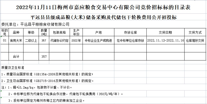 受客戶委托,梅州市嘉應(yīng)糧食交易中心有限公司定于2022年11月11日(星期五)上午10時(shí)在廣東省梅州市彬芳大道南161號(hào)梅州市糧食交易中心3樓,舉辦平遠(yuǎn)縣縣級(jí)儲(chǔ)備成品糧采購(gòu)公開(kāi)招標(biāo)。