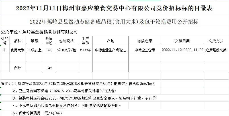 2022年蕉嶺縣縣級動態(tài)儲備成品糧(食用大米)及包干輪換費用公開招標公告