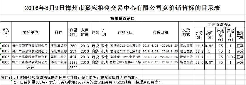 受客戶委托,梅州市嘉應(yīng)糧食交易中心有限公司定于2016年8月9日舉辦糧食競價(jià)交易會(huì),梅州市嘉泰糧食收儲(chǔ)公司擬銷售2013年產(chǎn)早秈三級(jí)稻谷2600噸。