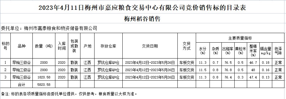 受客戶委托,梅州市嘉應糧食交易中心有限公司定于2023年4月11日(星期二)舉辦糧食競價交易會。梅州市嘉泰糧食和物資儲備有限公司擬銷售2020年早秈稻5820.58噸。