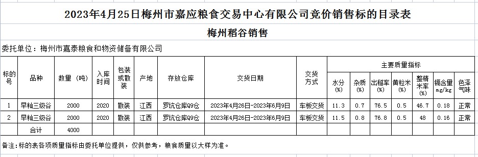 受客戶委托,梅州市嘉應(yīng)糧食交易中心有限公司定于2023年4月25日(星期二)舉辦糧食競(jìng)價(jià)交易會(huì)。梅州市嘉泰糧食和物資儲(chǔ)備有限公司擬銷售2020年早秈稻4000噸。
