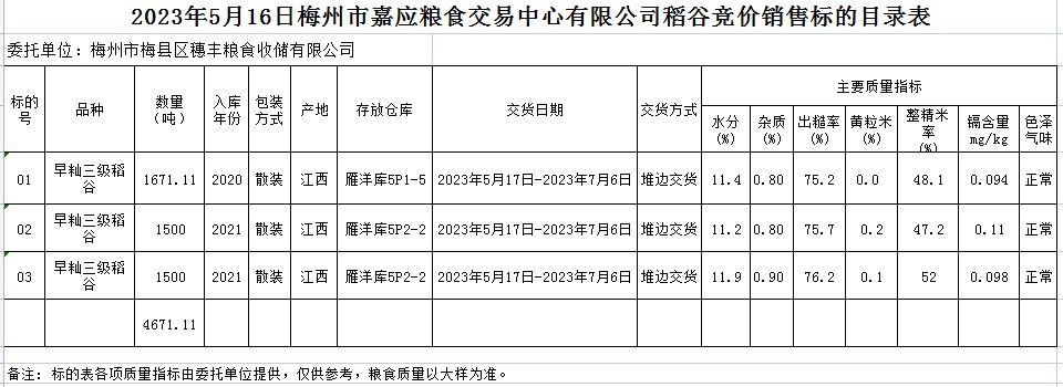 受客戶委托,梅州市嘉應(yīng)糧食交易中心有限公司定于2023年5月16日(星期二)舉辦糧食競(jìng)價(jià)交易會(huì)。梅州市梅縣區(qū)穗豐糧食收儲(chǔ)有限公司擬銷(xiāo)售2020、2021年早秈稻4671.11噸。