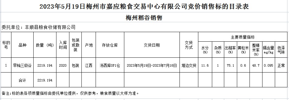 受客戶(hù)委托,梅州市嘉應(yīng)糧食交易中心有限公司定于2023年5月19日(星期五)舉辦糧食競(jìng)價(jià)交易會(huì)。豐順縣糧食收儲(chǔ)有限公司擬銷(xiāo)售2020年早秈稻2219.194噸。