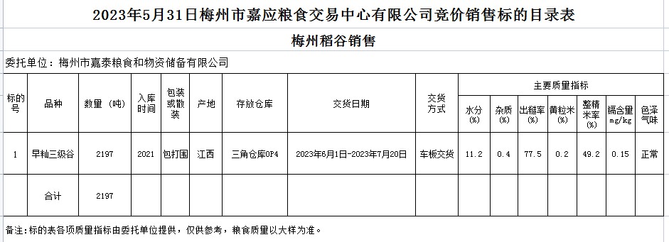 受客戶委托,梅州市嘉應(yīng)糧食交易中心有限公司定于2023年5月31日(星期三)舉辦糧食競價交易會。梅州市嘉泰糧食和物資儲備有限公司擬銷售2021年早秈稻2197噸。