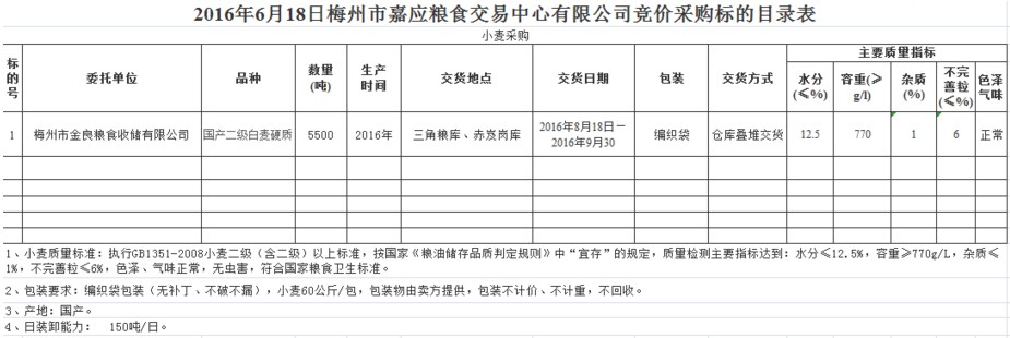 受客戶委托,梅州市嘉應(yīng)糧食交易中心有限公司定于2016年8月18日舉辦糧食競(jìng)價(jià)交易會(huì),梅州市金良糧食收儲(chǔ)有限公司擬采購2016年產(chǎn)二級(jí)硬質(zhì)小麥5500噸。
