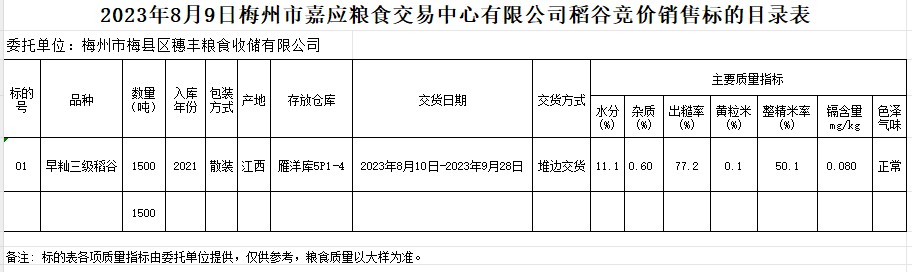受客戶委托,梅州市嘉應(yīng)糧食交易中心有限公司定于2023年8月9日(星期三)舉辦糧食競(jìng)價(jià)交易會(huì)。梅州市梅縣區(qū)穗豐糧食收儲(chǔ)有限公司擬銷售2021年早秈稻1500噸。