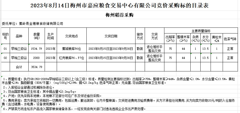 受客戶委托,梅州市嘉應糧食交易中心有限公司定于2023年8月14日(星期一)舉辦糧食競價交易會。蕉嶺縣金穗糧食收儲有限公司擬采購2023年早秈稻3534.79噸。