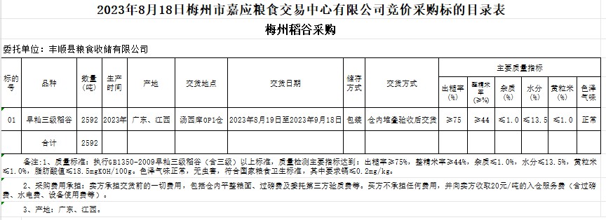 受客戶(hù)委托,梅州市嘉應(yīng)糧食交易中心有限公司定于2023年8月18日(星期五)舉辦糧食競(jìng)價(jià)交易會(huì)。豐順縣糧食收儲(chǔ)有限公司擬采購(gòu)2023年早秈稻2592噸。