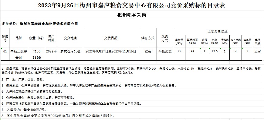 受客戶委托,梅州市嘉應(yīng)糧食交易中心有限公司定于2023年9月26日(星期二)舉辦糧食競價交易會。梅州市嘉泰糧食和物資儲備有限公司擬采購2023年早秈稻谷7100噸。