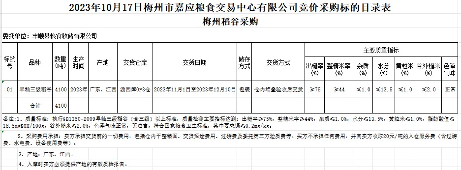 受客戶委托,梅州市嘉應(yīng)糧食交易中心有限公司定于2023年10月17日(星期二)舉辦糧食競價(jià)交易會。豐順縣糧食收儲有限公司擬采購2023年早秈稻谷4100噸。