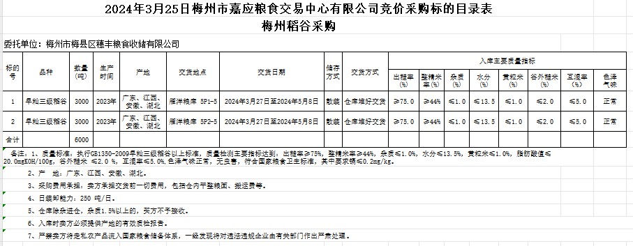受客戶委托,梅州市嘉應(yīng)糧食交易中心有限公司定于2024年3月25日(星期一)舉辦糧食競(jìng)價(jià)交易會(huì)。梅州市梅縣區(qū)穗豐糧食收儲(chǔ)有限公司擬采購2023年產(chǎn)早秈稻6000噸。