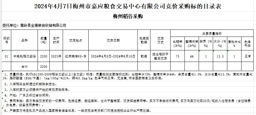 受客戶委托,梅州市嘉應(yīng)糧食交易中心有限公司定于2024年4月7日(星期天)舉辦糧食競(jìng)價(jià)交易會(huì)。蕉嶺縣金穗糧食收儲(chǔ)有限公司擬采購(gòu)2023年產(chǎn)中晚秈稻2200噸。
