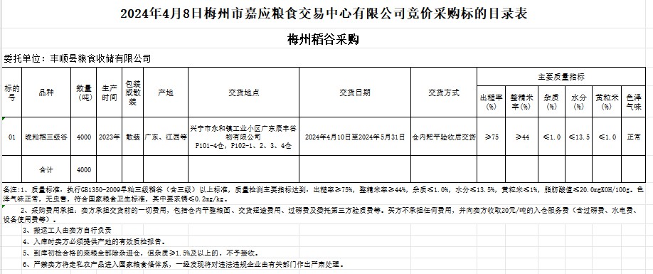 受客戶委托,梅州市嘉應(yīng)糧食交易中心有限公司定于2024年4月8日(星期一)舉辦糧食競價交易會。豐順縣糧食收儲有限公司擬采購2023年產(chǎn)晚秈稻4000噸。