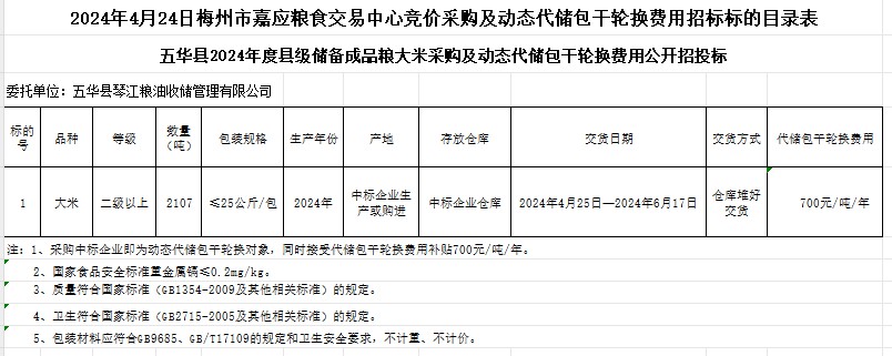 五華縣2024年度縣級儲備成品糧大米采購及動態(tài)代儲包干輪換費用公開招標公告