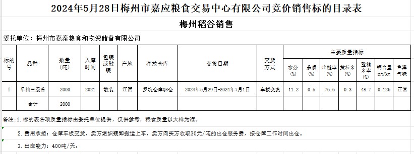 受客戶(hù)委托,梅州市嘉應(yīng)糧食交易中心有限公司定于2024年5月28日(星期二)舉辦糧食競(jìng)價(jià)交易會(huì)。梅州市嘉泰糧食和物資儲(chǔ)備有限公司擬銷(xiāo)售2021年產(chǎn)早秈稻2000噸。