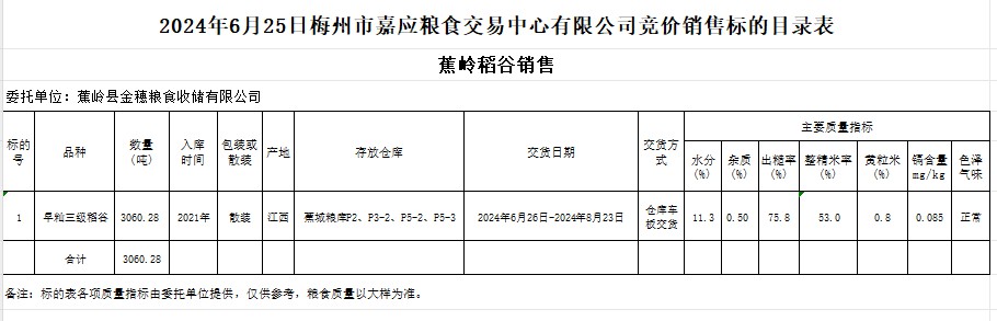受客戶委托,梅州市嘉應(yīng)糧食交易中心有限公司定于2024年6月25日(星期二)舉辦糧食競價(jià)交易會。蕉嶺縣金穗糧食收儲有限公司擬銷售2021年產(chǎn)早秈稻谷3060.28噸。