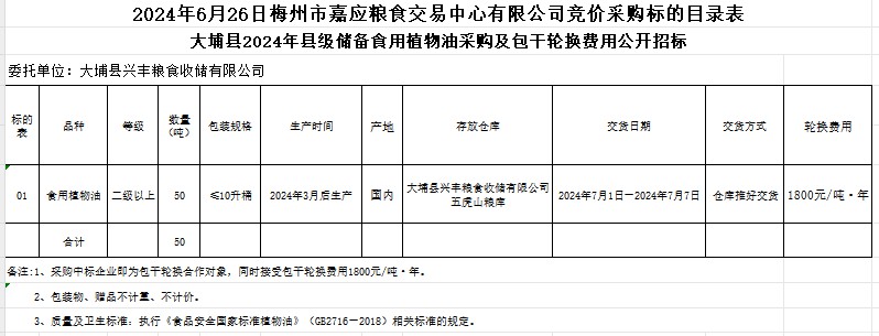 受大埔縣興豐糧食收儲有限公司委托,梅州市嘉應糧食交易中心有限公司定于2024年6月26日(星期三)上午10時在廣東省梅州市彬芳大道南161號梅州市糧食交易中心3樓,舉辦大埔縣2024年縣級儲備食用植物油采購及包干輪換費用公開招標。