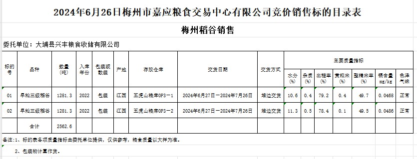 受客戶委托,梅州市嘉應糧食交易中心有限公司定于2024年6月26日(星期三)舉辦糧食競價交易會。大埔縣興豐糧食收儲有限公司擬銷售2022年產(chǎn)早秈稻谷2562.6噸。