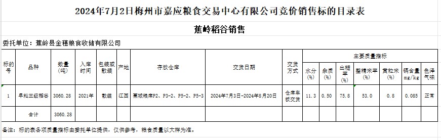 受客戶委托,梅州市嘉應(yīng)糧食交易中心有限公司定于2024年7月2日(星期二)舉辦糧食競(jìng)價(jià)交易會(huì)。蕉嶺縣金穗糧食收儲(chǔ)有限公司擬銷售2021年產(chǎn)早秈稻谷3060.28噸。