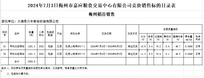 受客戶委托,梅州市嘉應糧食交易中心有限公司定于2024年7月3日(星期三)舉辦糧食競價交易會。大埔縣興豐糧食收儲有限公司擬銷售2022年產(chǎn)早秈稻谷2562.6噸。